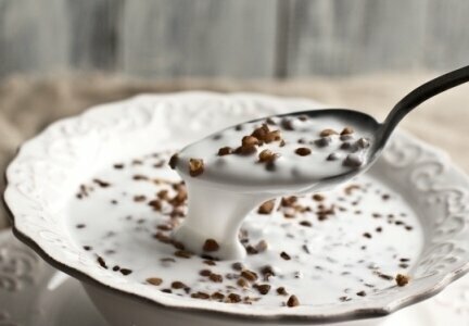 - 1 Столовую ложку молотой гречки залить 1 стаканом нежирного кефира или простокваши.