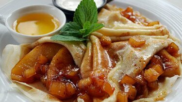 «Изюминка» этих блинчиков не только в начинке из груши, но и в светлом пиве, которое добавлено в тесто для эффекта дрожжей.